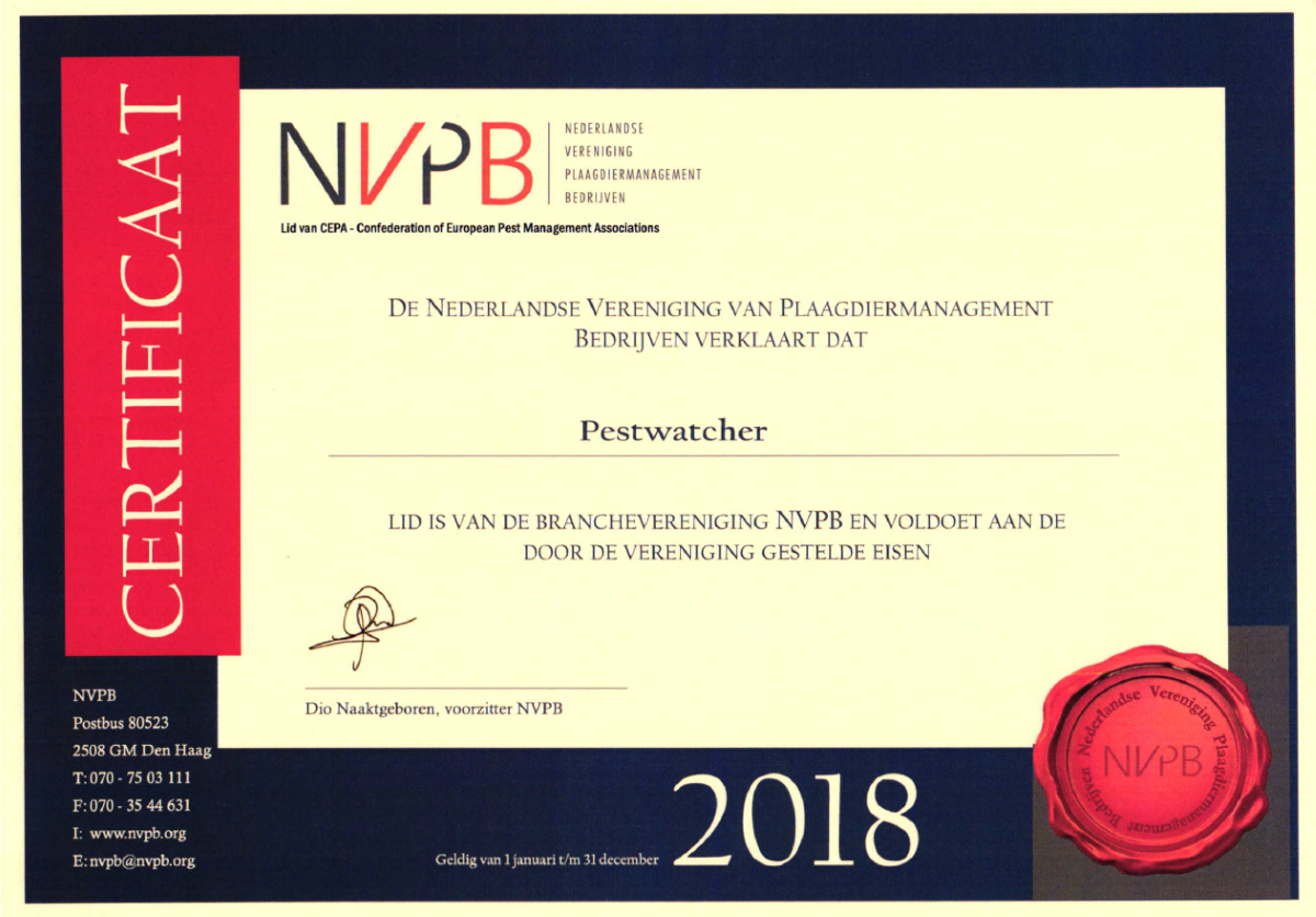 The NVPB is the association of Pest Management Companies in the The Netherlands. The NVPB represents the interests of 48 companies that jointly account for about 90% of the Dutch market in terms of executive activities. The association strives for an increase in the quality and further professionalisation of the entire industry. To contribute to this, the quality label for pest management has been developed.